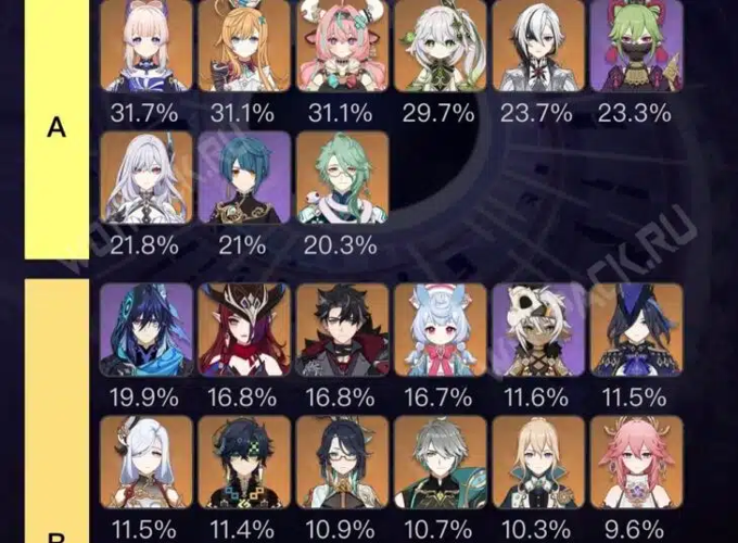 Schwertkämpfer wie Xingqiu (21 %) und Bogenschützen wie Ororon (19,9 %) werden ebenfalls regelmäßig gewählt, ebenso Duellantinnen wie Clorinda (11 %), vor allem aufgrund ihrer Effektivität gegen Gegner mit besonderen Abwehrmechanismen. Veteranen wie Pipilpan oder die eiserne Ente kommen ebenfalls oft zum Einsatz, um in den schwierigen Abyss-Abschnitten zu bestehen.