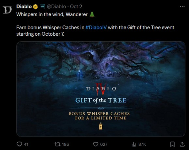 Starting October 7th, players can participate in the Gift of the Tree event in Diablo IV, where they have the opportunity to earn bonus Whisper caches. This special event encourages players to engage more deeply with the game, rewarding their efforts with additional caches that can contain valuable items. Don't miss out on this limited-time celebration to boost your in-game rewards and enhance your gameplay experience.